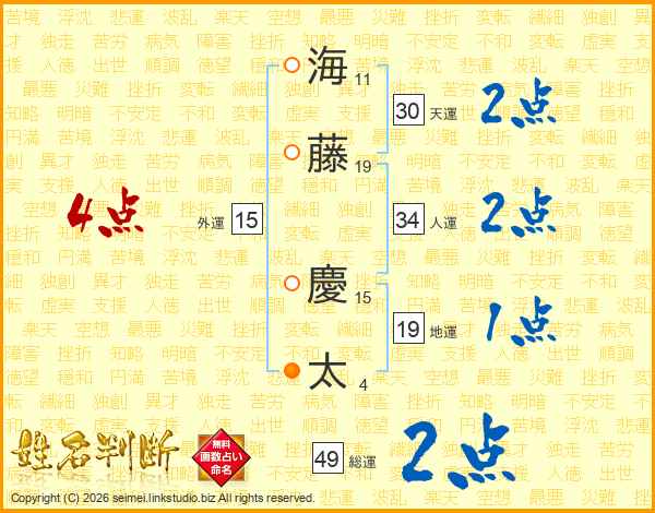 生活面を象徴する運勢です。外部から受ける影響力を表し、結婚運、家庭運や職場、環境への順応性を表します。総運から人運を引いた画数。姓や名が1文字の場合を除く。