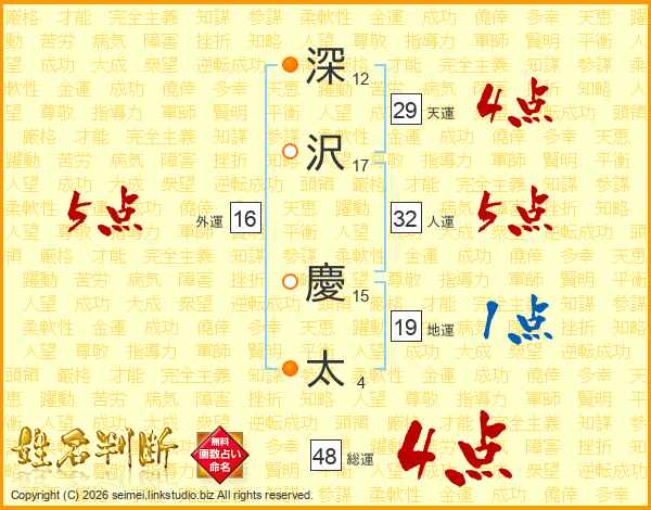 あなたの人生を表す1番重要な運勢です。生涯を通じて影響する総合運となり、主に50歳以降の晩年期に影響を及ぼします。苗字と名前の合計画数。