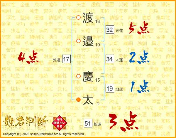 渡(13画)邉(19画) 慶(15画)太(4画)
