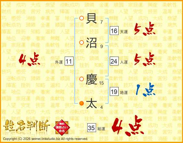 貝(7画)沼(9画) 慶(15画)太(4画)