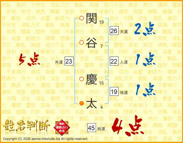 関(19画)谷(7画) 慶(15画)太(4画)