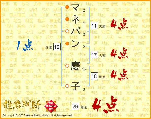 マ(2画)ネ(4画)パ(3画)ン(2画) 慶(15画)子(3画)