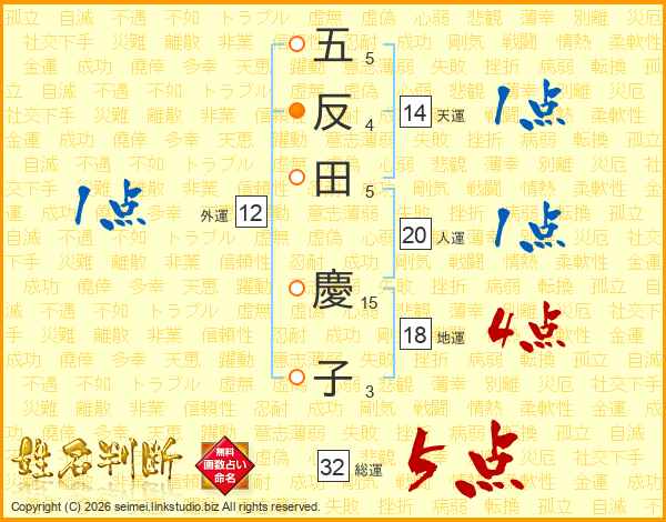五(5画)反(4画)田(5画) 慶(15画)子(3画)