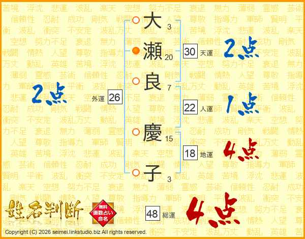 大(3画)瀬(20画)良(7画) 慶(15画)子(3画)