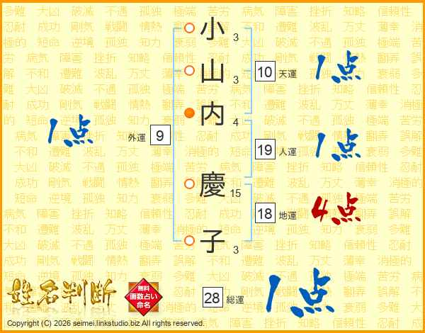 小(3画)山(3画)内(4画) 慶(15画)子(3画)