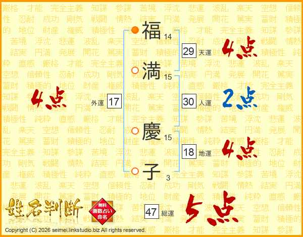 福(14画)満(15画) 慶(15画)子(3画)