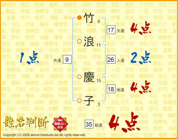 竹(6画)浪(11画) 慶(15画)子(3画)
