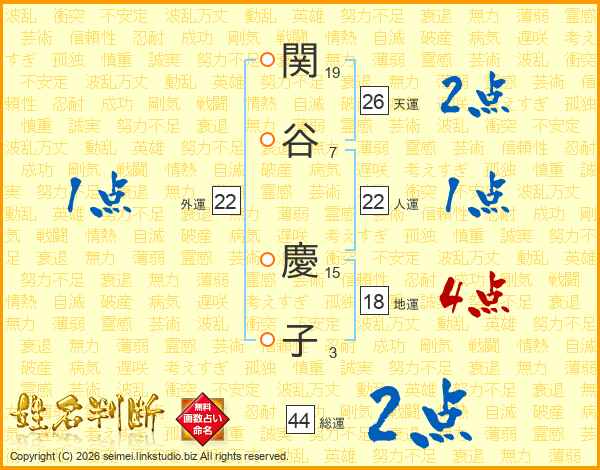 関(19画)谷(7画) 慶(15画)子(3画)