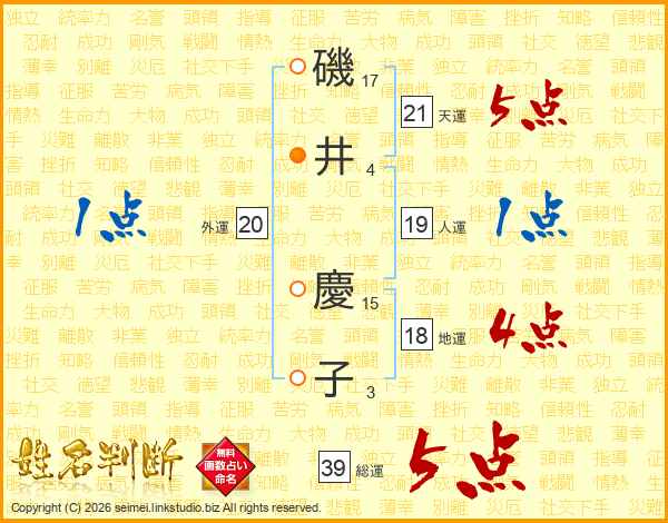 磯(17画)井(4画) 慶(15画)子(3画)