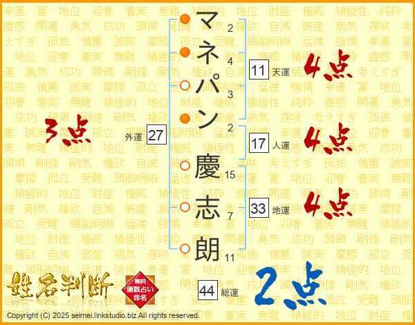 マ(2画)ネ(4画)パ(3画)ン(2画) 慶(15画)志(7画)朗(11画)