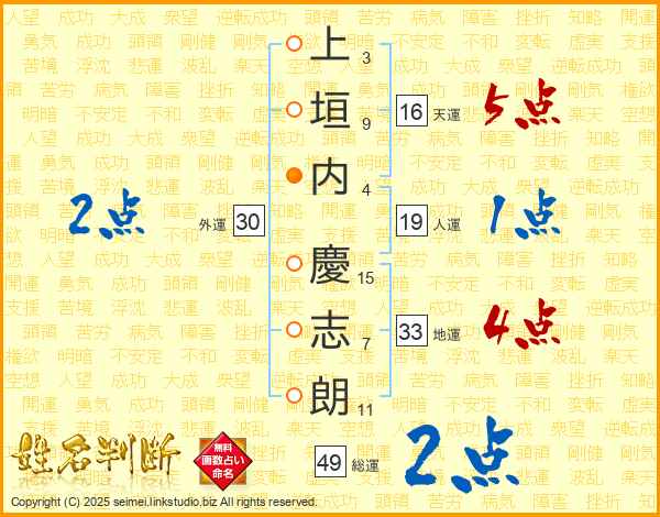 上(3画)垣(9画)内(4画) 慶(15画)志(7画)朗(11画)