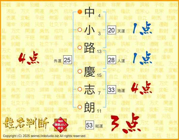 中(4画)小(3画)路(13画) 慶(15画)志(7画)朗(11画)
