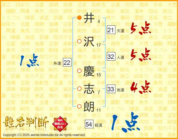 井(4画)沢(17画) 慶(15画)志(7画)朗(11画)