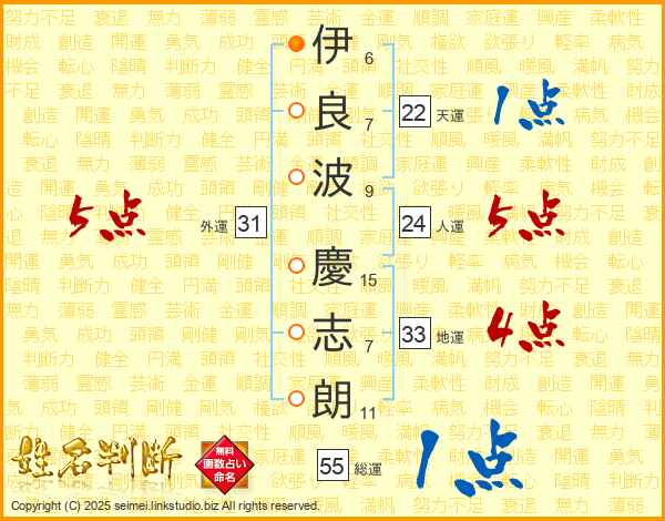 伊(6画)良(7画)波(9画) 慶(15画)志(7画)朗(11画)