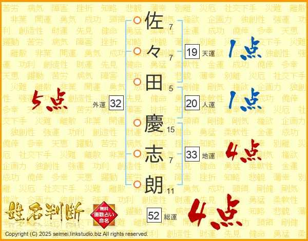 佐(7画)々(7画)田(5画) 慶(15画)志(7画)朗(11画)