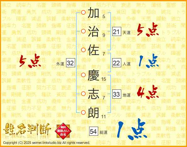加(5画)治(9画)佐(7画) 慶(15画)志(7画)朗(11画)