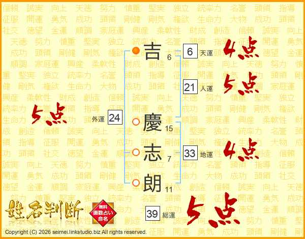吉(6画) 慶(15画)志(7画)朗(11画)