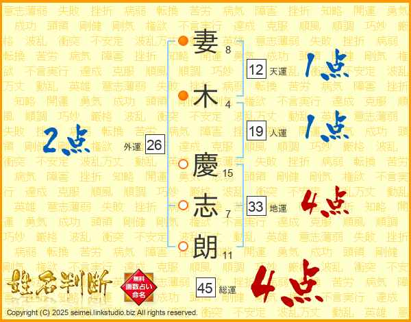 妻(8画)木(4画) 慶(15画)志(7画)朗(11画)