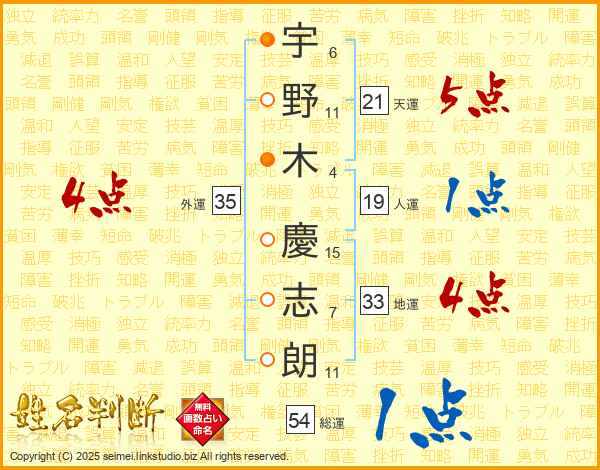 宇(6画)野(11画)木(4画) 慶(15画)志(7画)朗(11画)