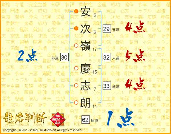 安(6画)次(6画)嶺(17画) 慶(15画)志(7画)朗(11画)