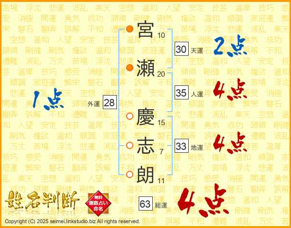 宮(10画)瀬(20画) 慶(15画)志(7画)朗(11画)
