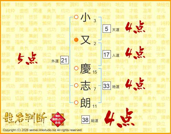 小(3画)又(2画) 慶(15画)志(7画)朗(11画)