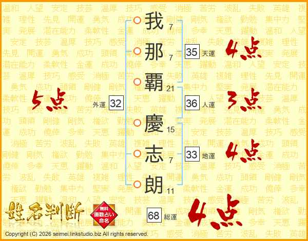 我(7画)那(7画)覇(21画) 慶(15画)志(7画)朗(11画)