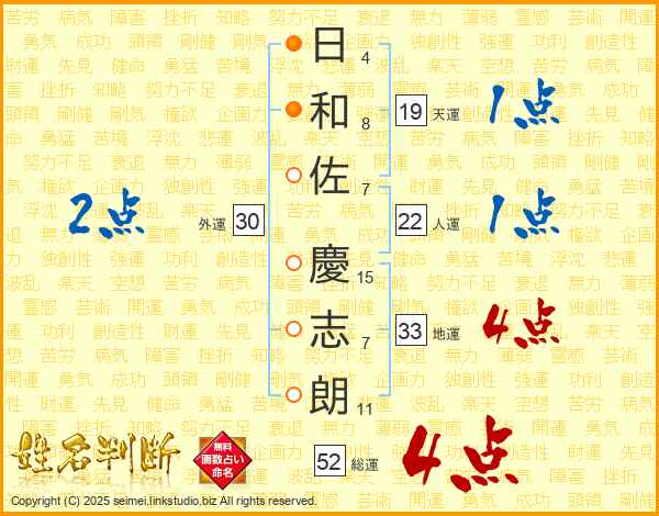 日(4画)和(8画)佐(7画) 慶(15画)志(7画)朗(11画)