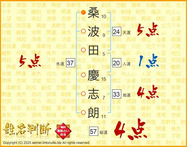 桑(10画)波(9画)田(5画) 慶(15画)志(7画)朗(11画)