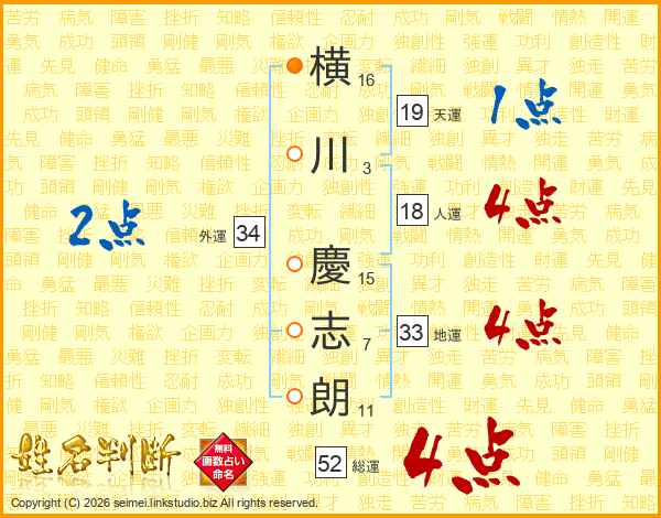 横(16画)川(3画) 慶(15画)志(7画)朗(11画)