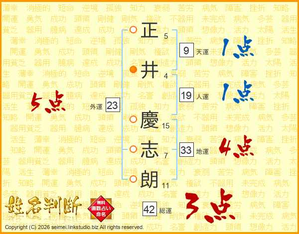 正(5画)井(4画) 慶(15画)志(7画)朗(11画)
