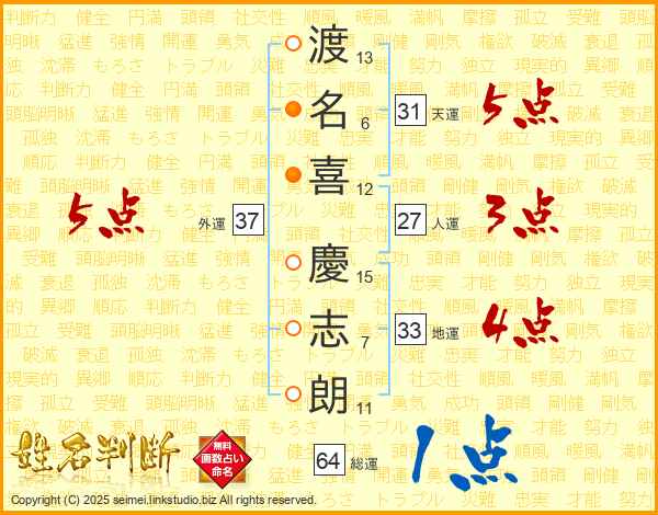 渡(13画)名(6画)喜(12画) 慶(15画)志(7画)朗(11画)
