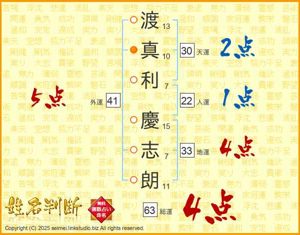 渡(13画)真(10画)利(7画) 慶(15画)志(7画)朗(11画)