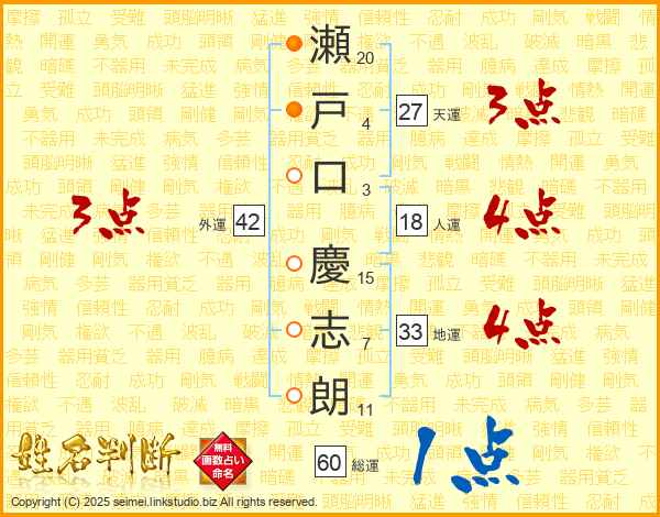 瀬(20画)戸(4画)口(3画) 慶(15画)志(7画)朗(11画)