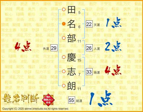 田(5画)名(6画)部(11画) 慶(15画)志(7画)朗(11画)