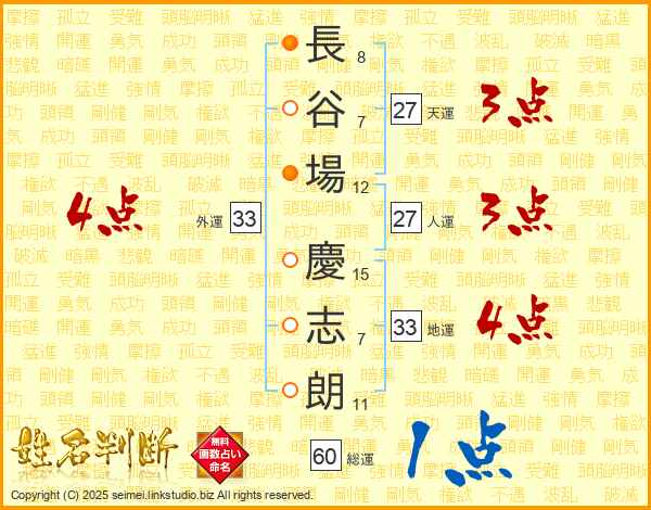 長(8画)谷(7画)場(12画) 慶(15画)志(7画)朗(11画)