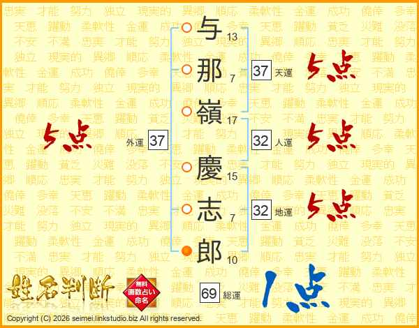 与(13画)那(7画)嶺(17画) 慶(15画)志(7画)郎(10画)