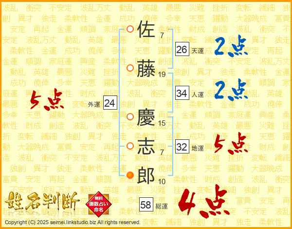 佐(7画)藤(19画) 慶(15画)志(7画)郎(10画)