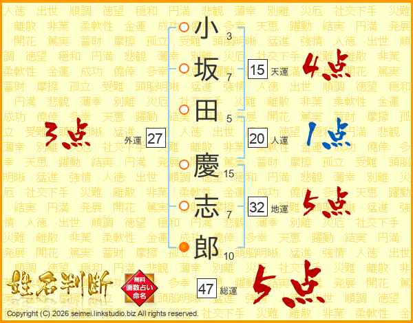 小(3画)坂(7画)田(5画) 慶(15画)志(7画)郎(10画)