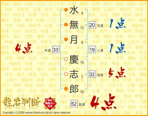 水(4画)無(12画)月(4画) 慶(15画)志(7画)郎(10画)
