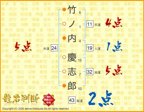 竹(6画)ノ(1画)内(4画) 慶(15画)志(7画)郎(10画)