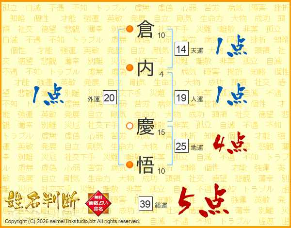倉内慶悟さんの総運は39画の5点!