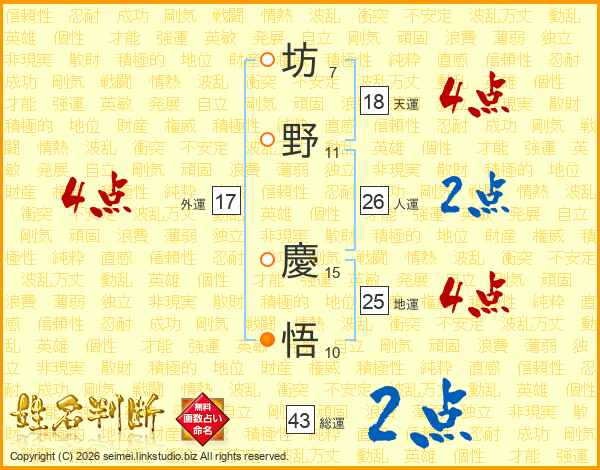坊(7画)野(11画) 慶(15画)悟(10画)