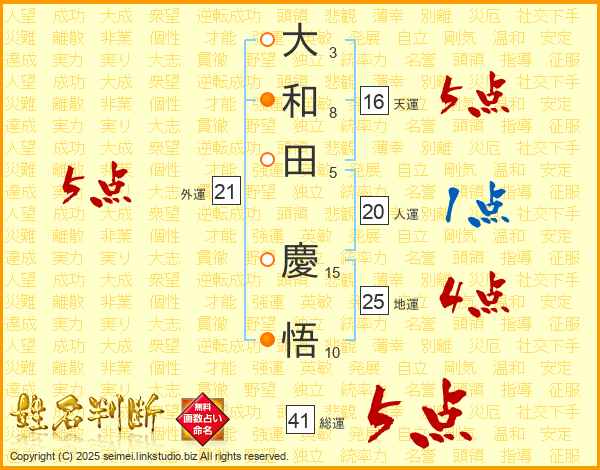 大(3画)和(8画)田(5画) 慶(15画)悟(10画)