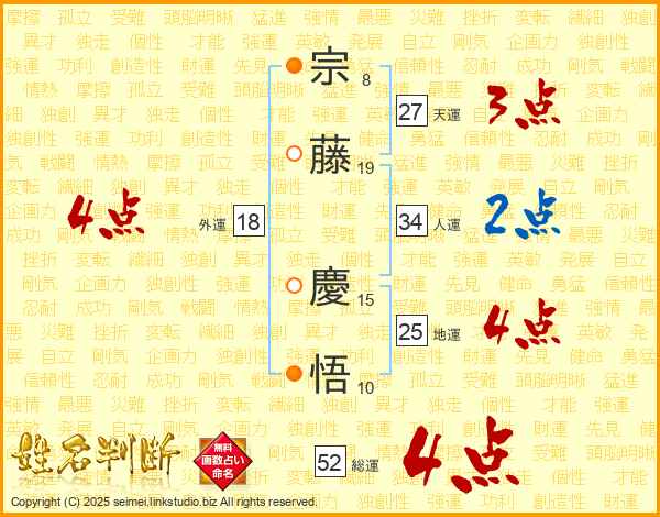 宗(8画)藤(19画) 慶(15画)悟(10画)