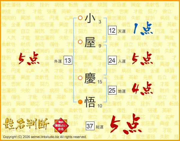小(3画)屋(9画) 慶(15画)悟(10画)