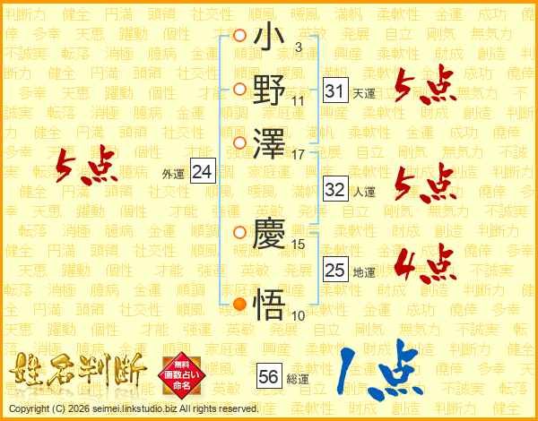 小(3画)野(11画)澤(17画) 慶(15画)悟(10画)