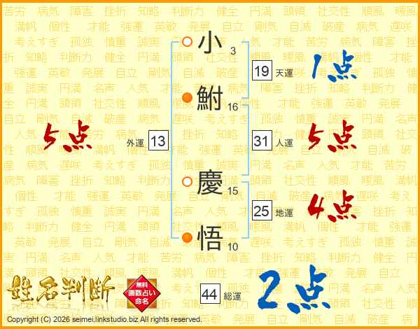 小(3画)鮒(16画) 慶(15画)悟(10画)