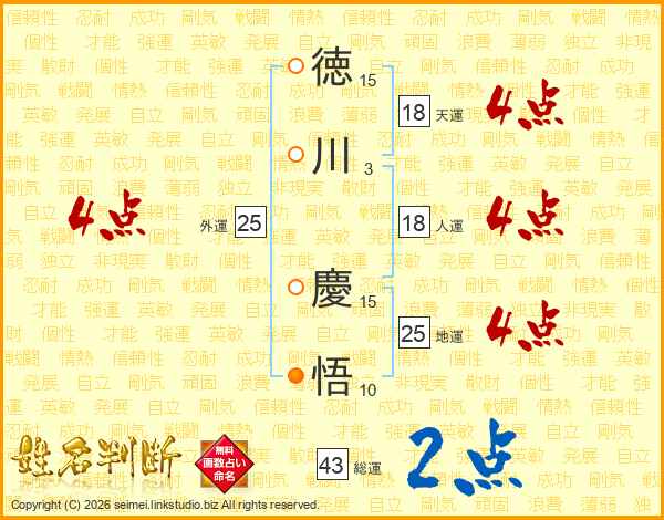 徳(15画)川(3画) 慶(15画)悟(10画)