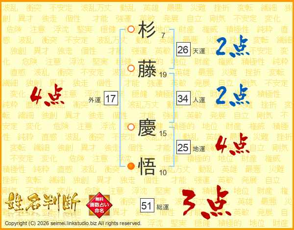 杉(7画)藤(19画) 慶(15画)悟(10画)